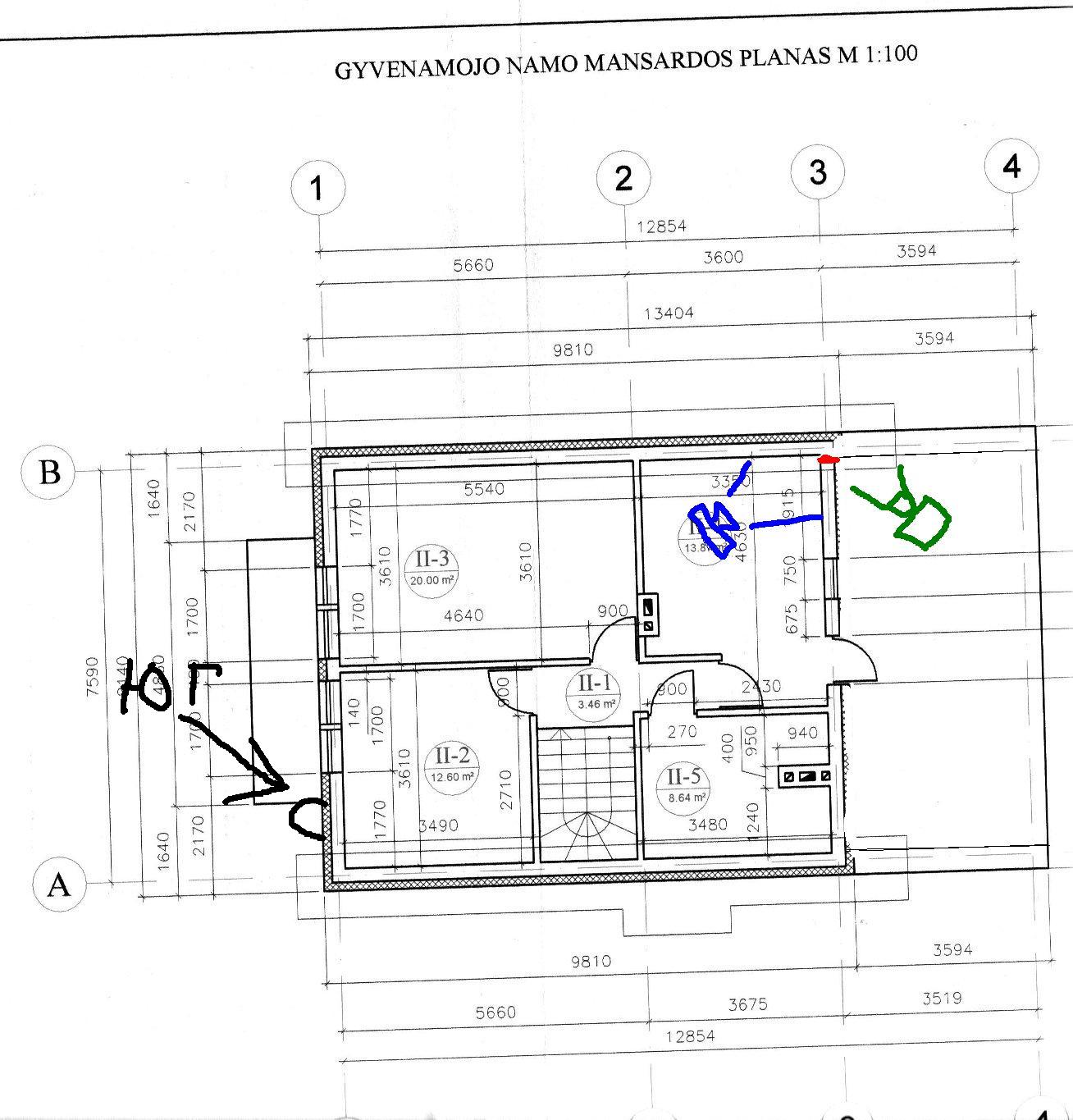 Помещение - мансарда, внутренних стен нет, только внешние, правда дымоходы мешаются. Трещина в западном углу помечена красной линией. Синим цветом-откуда сделанно фото, зеленым - видеоролик.