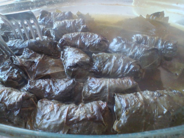 Мелко рубим лук, добавляем в фарш, туда же мелкопорубленую зелень (кому сколько нравиться... я люблю многА ) КСтати, мята придает приятный и необычный вКуС... Солим, перчим, добавляем пол чайной ложки мускатного ореха или зиры (у меня дома никто зиру не переносит... кроме меня.. ) Тщательно вымещиваем... Затем... в некоторых рецептах предлагается обжаривать полученный фарш, но я так не делаю... мне кажется, что без обжарки получается нежнее и сочнее...  Затем берем листья... опять же... некоторые советуют их сначала ошпарить кипятком или даже прокипятить для пущей мягкости... но я маринованные листья предпочитаю не мучить... (я итак могу их отлично прожевать ) Ну вот и почти все... закладываем фарш в листья... заворачиваем... Я посоветую запечь долму в духовке (хотя можно и в кастрюле приготовить на плите ). Так значит выкладываем на протвень с высокими бортиками... заливаем бульоном ... говяжьим или куриным.... да хоть овощным ... Посыпаем укропом и в духовку примерно на 1 час при 200 градусах...  Остается только сделать соус... на 300 грамм мацони я кладу 2-3 зубчика чеснока, свежемолотый чОрный перец и соль по вкусу...( хотя особо ленивые могут и обойтись сметаной... ) Вот и все... Просто и со вкусом... Лыхайм!