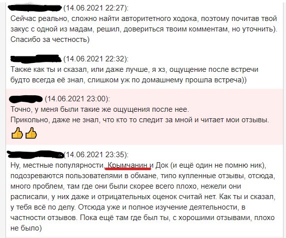 1) Никакое агенство не имеет достпуп к информации админов ИС. Никто не скажет, кроме админов ИС причину блокировки. 2) Не верю, что админы ИС не сказали причину. Я сам был недавно жертва блокировки, так же неожиданно. Многие доны в курсе этого. И мне ответили и было долгое разбирательство и тд и тп. 3) Админы ИС не блокируют по жалобе какого нибудь Дона - это факт. 4) Допустим, что я. То есть я , со слов Крымчанина, хожу по феям, плачу деньги и тупо трачу время на стенографию походов Крымчанина и как он трахается? Или во время кекса - кладу на спину феи блокнот и ритмично записываю показания? 5) Крымчанин не сможет предоставить доказательства от упомянутого им агенства, тк я также знаком с данным агенством (как познакомился это не важно, на опыте и частом хождении прикидываешь "палец к носу") так вот, мы с руководством этого агенства ловили Крымчанина НА ВРАНЬЕ. 6) Кто не знает Дока, нууу.... это странно, но не суть. Он тут не зарегистрирован, но в курсе того что происходит. Крымчанин не пойдет против Дока. Док проедет по нему своим авторитетом, как катком. 7) Я никогда не сомневался в том, что Крымчанин существует ( как он описывает того, кто собирает о нем инфу) 8) Согласен, что словам фей верить нельзя на 100%, но я никогда не начинал разговор о других ( смотрите пункт 4). Феи сами все рассказывают и по случаю, мимоходом. И Крымчанин у многих ассоциируется с негативом и неприязнью. 9) На ИС и тут тоже я неоднократно встечал комментарии к отзывам после Крымчанина, что ему верит нельзя и что после него - одно разочарование. Правда тут и Доку достается, видимо цепочка еще актуальна. 10) Исходя из пункта 10, у меня есть свои "почитатели", которые мне верят и ходят по феям после меня и проблем не было, в отличе от Крымчанина. (смотрите фотку, как 1 пример)