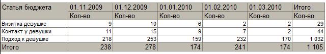 То бишь подход - количество подходов, завершившихся ничем. Визитка девушке - при подходе девушке была вручена моя визитка. Контакт у девушки - при подходе девушка дала контакт.