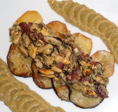 Рецепт не уникален. Можно что-то подобное подсмотреть тут, например. В отличие от приведенного выше рецепта, я обжарил тонкие кружочки картофеля и баклажанов, на которые и раложил отдельно приготовленные мидии (на фото). Народ смёл все на раз. Гарнир - пюре из нута. Для злопыхателей могу предложить рецепт пюре из арбузных корок с анчоусами, каперсами и дижонской горчицей