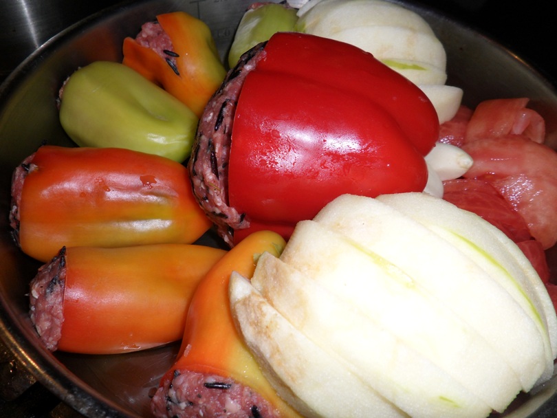 Все вроде и так ясно? Мясо - говяжий фарш (с сушеный базиликом, черным перцем, мускатным орехом, солью, сушеными томатами, красным перцем, паприкой и кориандром), в нем - зернышки дикого черного риса (не выёпывалс, просто дома другого не оказалось). Там же яблоко, очищенное от кожуры, там же чеснок, там же веточки тимьяна и розмарина, там же помидорко, без кожурки. Сфотать после готовки не успел - гости все съели очень быстро.