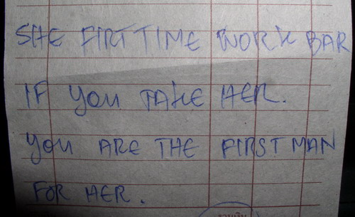 Сразу же нужно отметить, что по-английски Пэнг не говорила. Совсем никак. Может быть, два-три слова, и то, не вполне понимая их смысл. Роль переводчика выполняла Нонг. "Я вижу, ты хороший человек. У тебя доброе сердце. Вам будет хорошо обоим." - так напутствовала меня хозяйка бара, само название которого казалось символичным - это был Lucky Bar. Ну и конечно же, смысл фразы насчет "первого мужчины" никого не вводил в заблуждение - подразумевалось, что у Пэнг сегодня - дебют на сцене в дуэте с фарангом