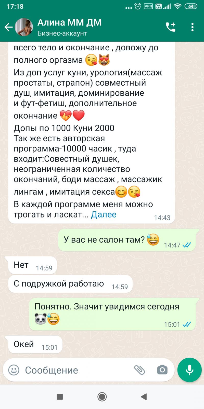 Рассказ. мой выбор пал на красотку Алину по очень вкусной цене за 4К: https://don-m.nl/msk/307785/ Написал ей в ватс апп днем в пятницу, но не получив подтверждения (двух галок) о дошедшем сообщении, решил написать второй отложенной красотке (внезапно за те же 4К, да еще и в том же районе) Александре: https://don-m.nl/msk/300137/