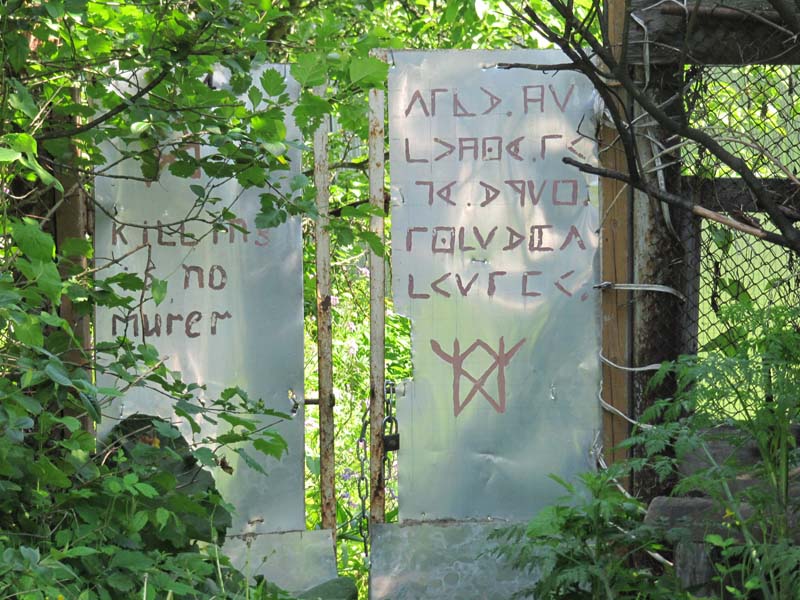 Сосед по даче, мужик лет 50, наводит ужас на дачников. Чем именно - никто не признается, но все утверждают что он сектант и может чуть ли не остановить вращение планет вокруг солнца . Я как-то никогда на него внимания не обращал, а тут проходил мимо его участка, а там - во чего! Полиглоты есть? Слева что-то на корявом английском - могу предположить, что в вольном переводе означает: "Убийство - не самое страшное , что я могу с вами сделать" . Но что изложенно справа - мне самому не понять.