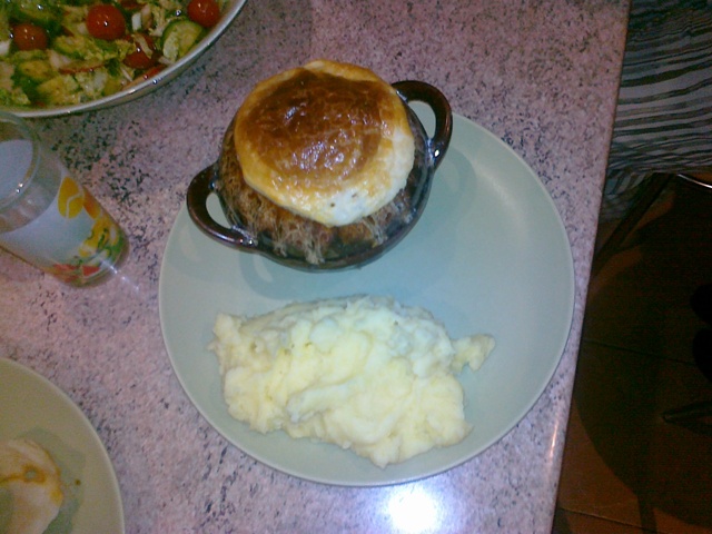В принципе, полученное рагу отлично идет и само по себе с картофельным пюре.... Но можно для форсу разложить все по порционным горшочкам, сделать для них крышочку из слоенного теста и поставить в духовке еще на 20 минут...