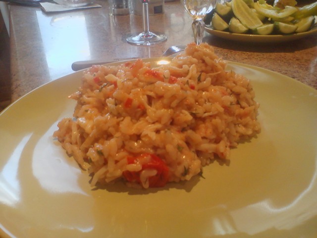 В связи с этим вспомнил, что можно сделать с крабами.... Риззото... КСтати, вместо крабов могут быть омары, лобстеры и пр.... Итак, лук мелко нарезается... Сливочное масло растапливается в кастрюле... Обжариваем лук слегка... Добавляем рис... ни в коем случае не промывать его перед этим!!! Прокаливает рис пока он не станет чуть прозрачным... и не впитает большую часть масла... КСтати, можно чуть долить и растительного... для полноты вкуса... Затем белое вино... У меня из белого сухого был только брют ... и он отлично подошел!!! Выпаривает большую часть вина, остальное должно впитаться в рис... Затем частями добавляем бульон... Где-то по стакану за раз... При этом постоянно помешиваем... Когда рис приобретет требуемую кремовую консистенцию и мягкость, добавляем порезанные помидоры и сливки... Солим-перчим... Потом, добавляем крабов предварительно отваренных.... Еще пару минут прогреваем и сразу подаем!!!! Есть надо только в горячем виде!!!!