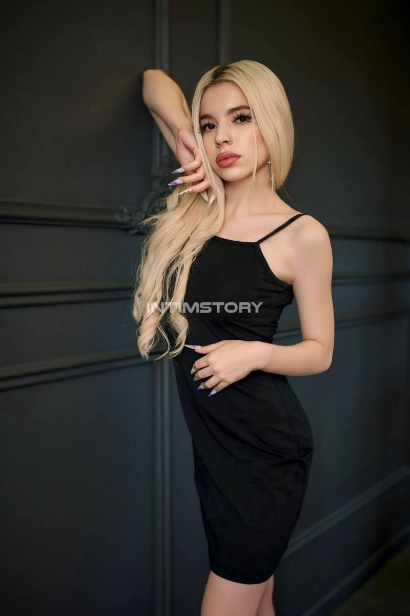 Всё как на фото один в один! Личико маленькое с большими нарощенными ресницами. Глаза: тёмно-карии (немного стесняется, когда смотрит в глаза). Губы у неё подкаченные и очень красивые! Волосы прямые, до пояса, крашеная блондинка.