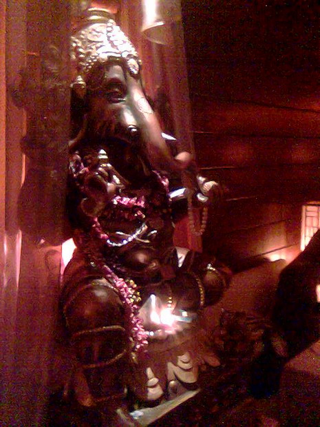 Интерьер в полумраке, деревянные столики, какая то ведическая музыка, статуэтки из азии каких то богов и животных, книги даже восточные стоят. Ресторан открыт при содействии посольства Таиланд.