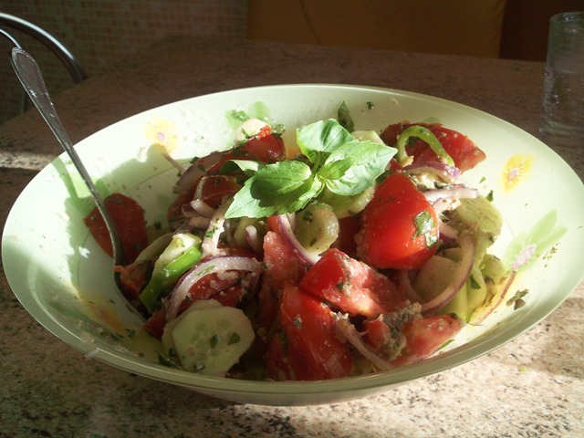 Огурцы 4-5 шт. необходимо снять шкурку и порезать кружками Помидоры 4-5 шт. просто ломтиками Фиолетовая луковица 1 шт. просто кольцами Один острый зеленый перец Все перемешиваем...
