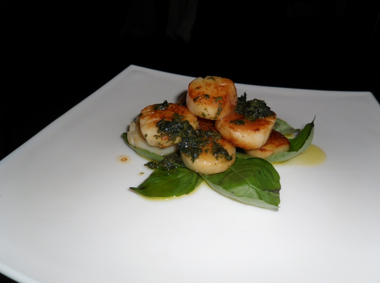 Рецепт несложен. Гребешки отвариваются 3-5 минут в кипятке, отбрасываются на дуршлаг, чтоб вода стекла, и обжариваются 10-15 минут на среднем или малом огне на сливочном масле до появления характерной золотистой корочки. Готовится соус из базилика. Листья промываются, обсушиваются бумажным полотенцем, растираются в ступке (или измельчаются в блендере) с добавлением сыра пармезан, оливкового масла, соли и перца. Вместо оливкового масла можно использовать то, на котором гребешки жарились, но получается тяжеловато. В принципе - добавить кедровых орешков - и песто, но тут - на любителя. Несколько целых листочков базилика выкладываются на центре тарелки, а на них - гребешки.
