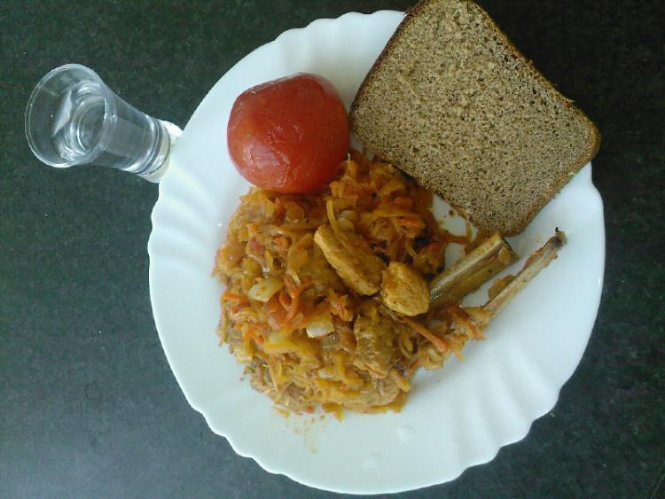 Для начала срезал с ребрышек все сало (а у тамошних хрюшек его совсем немного) и вытопил его. Шкварки получились суперские и до сих пор жалею, что выкинул их, даже не попробовав под пиво. Далее готовил по принципу узбекского зирвака для плова: в топленом сале обжарил лук, потом мясо, потом морковь. Ну, и когда все это дело было почти готово, заложил капусту, болгарский перец и помидор. Убавил огонь и оставил на полчаса тушиться. Помидоры почистил (это делаю всегда, даже в салат), а вот с болгарского перца кожицу снять не удалось (еще не научилсо((. Соль сюда, по понятным причинам, не нужна. А специи, если и добавлять, то совсем немного. Конечно, по картинке вкуса не передать. Да и блюдо это не из тех, которые своим ярким видом блистают в глянцевых кулинарных журналах. Да и на фотках смотрится не презетабельно. Зато это — русская рабочая лошадка, которую не надо обливать по бокам тонкими струйками красного соуса вперемешку с желтым, украшать заморским пармезаном, несъедобными листиками мяты и никчемными зернами граната. Баловство все это))