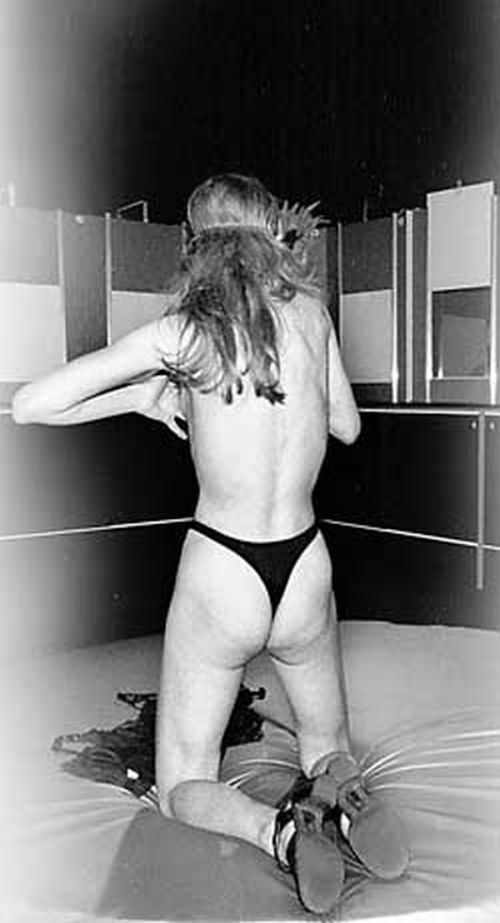 Я беру «обычную» кабинку — на шесть минут. Кабинка темная, размером с туалетную. Голые грязно-красные стены. Ни стула, ни табуретки. На уровне лица — окошко, закрытое жалюзи. Бросаю жетоны в щель, и шторка едет вверх. За стеклом видна комната с высоким потолком и нелепым пейзажем на стене. Посредине комнаты вращается круглый мат-подиум. На нем лежит девица.