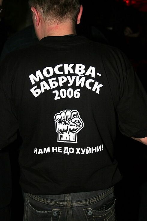 Что же касается вышеописанных присутствующих, то в футболке "Москва-Бабруйск 2006" был только я, ваш покорный слуга. Остальные щеголяли отнюдь не форменной клубной одеждой, так как были падонками, переместившимися вместе со мной из клуба "АЛИБИ" с международного слёта падонков "ЙОПАТИ-IV". "Михаил"- это Михаил Хаммер автор и исполнитель знаменитой культовой песни "Американцы пришли на танцы- получат песды!" Её-то и посчастливилось услышать автору отчёта . Прозаические креативы Хаммера лежат туточки : http://www.padonki.org/?full_list=3&authors_ids_list=;569;623; Также с нами был и nasa_astronaut посетивший тусу в "АЛИБИ" и даже снявшийся там в очередном высокохудожественно-документальном фильме "Вас Обосрали!", сказав в объектив сокраментальную удафкомовскую фразу: "Ипитесь в род!"