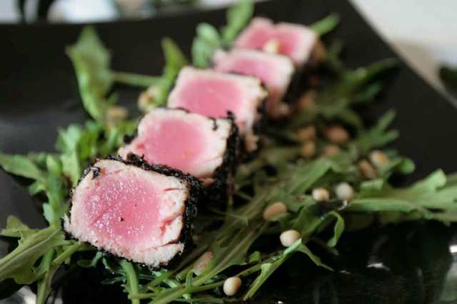 Что делать: Рыбу разморозить. Разрезать на 2 длинных бруска, по 1 шт. на порцию. Обвалять в чае со всех сторон и обжарить на части оливкового масла по 30 сек. С каждой стороны. В середине тунец должен оставаться сырым. Оставшееся масло взбить венчиком с бальзамическим уксусом. Добавить орехи. Рукколу промыть, просушить. Заправить соусом. Выложить на тарелку. Тунец аккуратно нарезать ломтиками и выложить на рукколу. Подавать сразу.