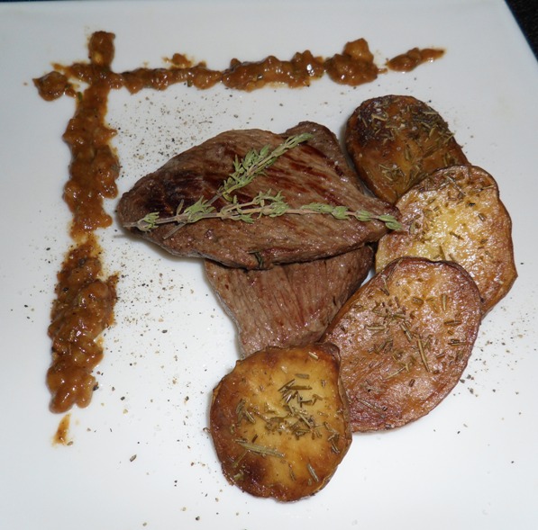 Ингредиенты все те же: картофель, говядина, розмарин, пару веточек тимьяна, соль, перец. Соус, на основе мясного сока, выделяемого при жарке, специально чуть загустил.