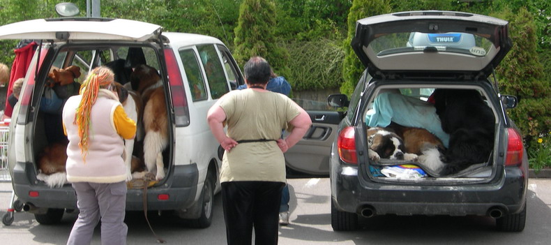 В машине справа - сенбернар и ньюфаундленд, в автобусе - 4 взрослых сенбернара и 1 подрощенный щенок