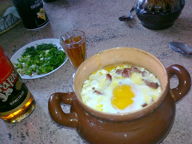 Брынзу можно изначально вымочить в воде или молоке, чтобы убрать лишнюю соль (я обажаю все солёное, поэтому, готовлю так! ) Натираем порционный глинняный горшочек сл. маслом и кладем небольшой кусочек внутрь, добавляем порезанную кубиками брынзу, перец и помидоры полукольцами, колбаску соломкой /(необязательный ингридиент, но с ним для меня вкуснее палюбому! ) и ставим на 20-25 минут в разогретую духовку (180-200 градусов). Когда брынза растаила и содержимое начинает булькать, вбиваем в горшочки по яйцу (можно сделать такую небольшую воронку и яйку туда ) и еще в духовку на 5 минут.