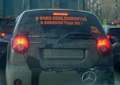 На Ярославке передо мной метрах в ста пилил ( и довольно шустро ) какой то " каблук " .На задней двери ,очень грязной что то было выведено пальцем . Любопытство взяло вверх ,нажал педальку ,догнал и ,прочитав на 110 км/ч каракули ,охренел и резко свалил в сторону . Надпись гласила : " СТОП-СИГНАЛЫ НЕ РАБОТАЮТ ! " Фотать не решился .