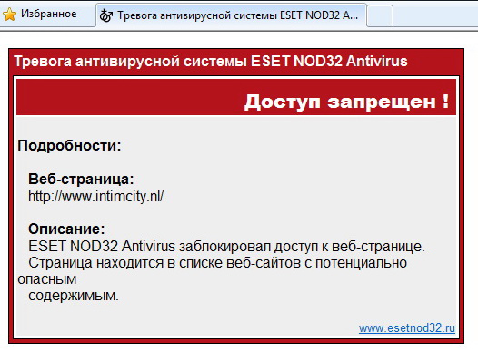 Уже 3-й день не могу зайти на ваш сайт, всё время получаю сообщение ================== Доступ запрещен! Подробности: Веб-страница: http://intimcity.nl Комментарий: ESET Smart Security заблокировал доступ к веб-странице. Страница находится в списке веб-сайтов с потенциально опасным содержимым. ==================