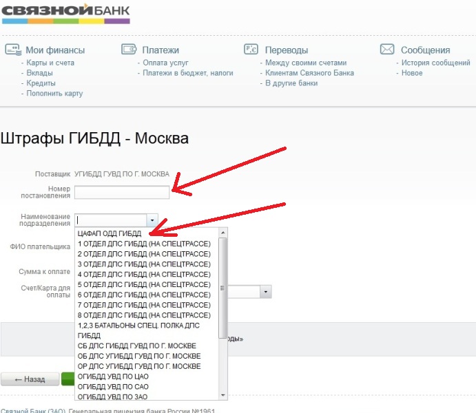 А вот уже непосредственно ввод платежа, где можно указать номер постановления и подразделения, вынесшего оное: