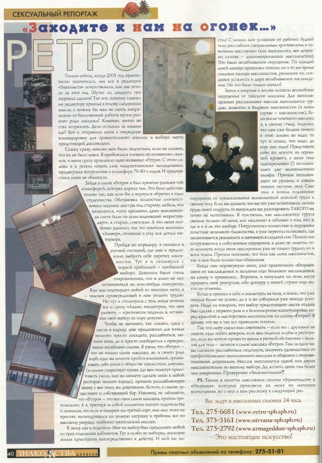На эти сайты вышел по отзывам на Секстолке. Времени на поиски было мало, при беглом просмотре Русдосуга контингент не впечатлил, на Досуге.cz показалось дорого... Я в Питер попадаю в среднем раз в 10 лет, в прошлый раз с успехом воспользовался объявлением массажного салона (текст прикрепляю), девушка с достойными ТТХ обошлась тогда в 1 т.р. Но где они сейчас, эти салоны?