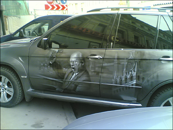 существуют нормативные акты к закону о наружной рекламе, по которым любые надписи на машинах, занимающие более определенной(кажется 30%) площади(данной детали кузова или части авто - точно не помню, т.к. автореклама для меня не основной "хлеб") требуют согласования в гибдд и получения отдельного рекламного паспорта. Я уж не говорю про перекраску кузова(хотя бы частичную). Т.о. любые такие "художества" на бортах авто вполне могут служить мотивировкой к остановке гайцами и соответственному "разводу кроликов"