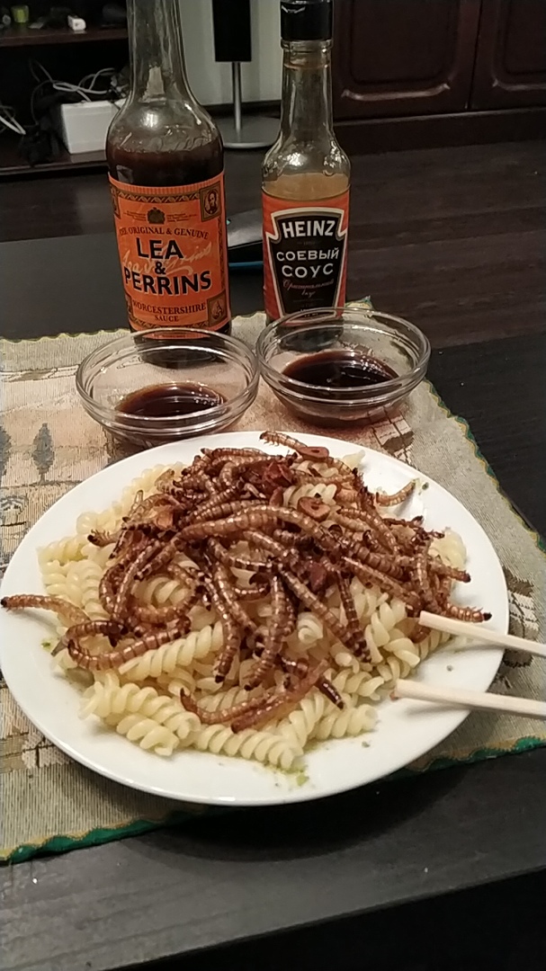 опережая возможные вопросы: немного орехового вкуса (скорее арахис, но его там нет, разумеется), обжаривал с чесноком и солью - все. Дорого - да, я нашел варианты сильно дешевле потом, но не собрался повторить, хотя в принципе ничего ужасного в гусеницах не вижу, тем более, что уже ел. Разводители всяких ящериц и тд наверное лучше подскажут, где зофобаса брать дешево. Надо других еще пробовать. Гусеницы - еда будущего (я правда так считаю)