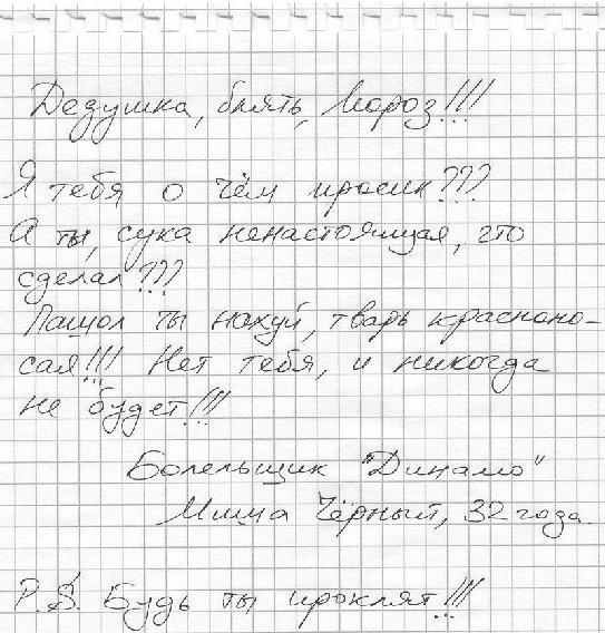 Итак, ряженная бородатая «;%:;, внимание! Пошуруй у себя в заднице ледяным посохом, и вспомни что скворечник и микроскоп у меня уже были. Говорящих кукол мне тоже не надо, ибо набором "Фасолька-джихад" мы наслаждаемся и по сей день. Разборные конструкции прибереги для аутистов - у меня вся квартира разборная, как шалаш Ильича. Да, а если у тебя, старый засранец, возникнет очередная гениальная идея подарить мне что-нибудь умное и полезное, то ты эту идею гони на фиг, потому что билеты до Устюга дешевы. Вата в заднице - не лучшее украшение и тебе стоит ко мне прислушаться.