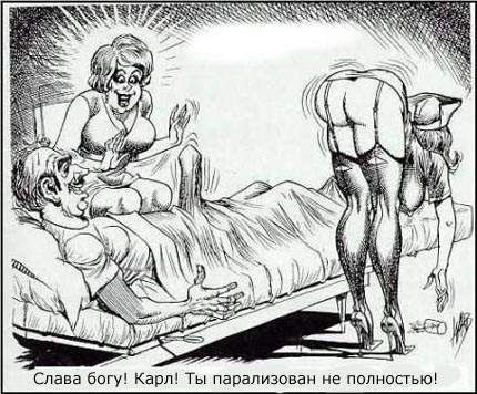 Ну и убил до кучи, уполз под стол от смеху..  Но эт про дэушкофф картинка, про нас что нить лучче из аника: Дед приходит в публичный дом и по очереди методично трахает там весь персонал без исключения. Хозяйка не может удержаться и пытается выяснить, откуда у того столько сил на старости лет. На что дед отвечает: -да знаете...как то удачно так парализовало..