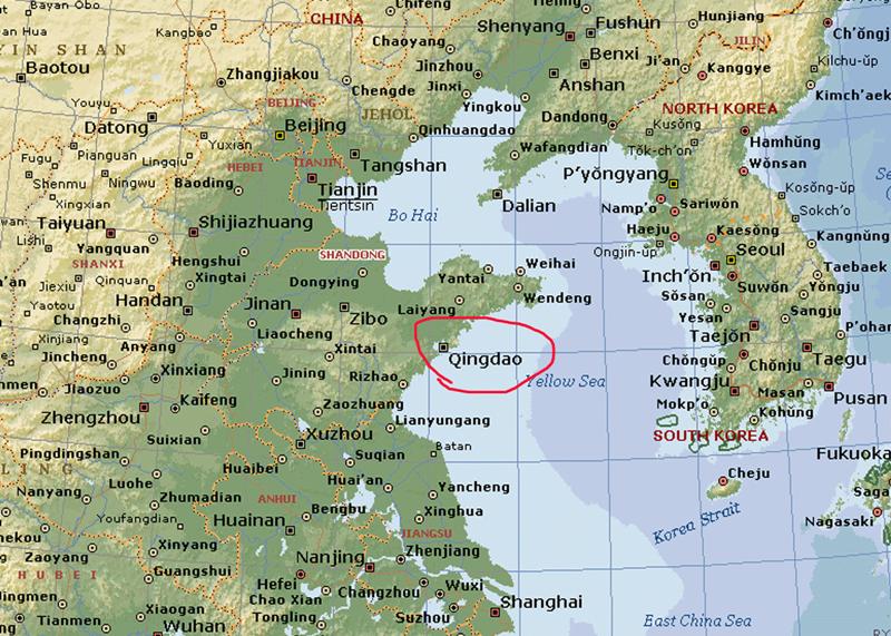 Если речь о населенном пункте с геокоординатами 36 град 05 северной 120 град 20 восточной, что в провинции Шаньдун, то в русском языке этот нп принято именовать Циндао, еще во времен русских царей! Почитайте, ну тот-же "Порт Артур" Степанова, что-ли!