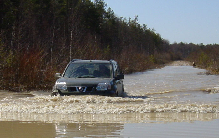 Вот такие дороги в России, стоит отъехать 1300 км. от Москвы Это грейдерная дорога меж двух верхоВЫХ болот в период весеннего таянья снегов. При этом надо заметить, что воды в этом году было ОЧЕНЬ мало