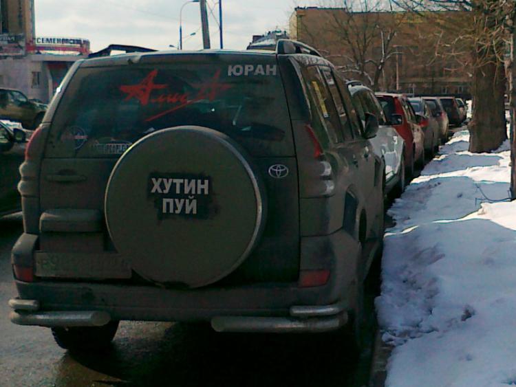 Вчера вместе с одним известным КЛСником видели надпись на запаске большого черного джипа надпись: "Хутин Пуй!" Коллега сфоткал, грозилсо вывесить