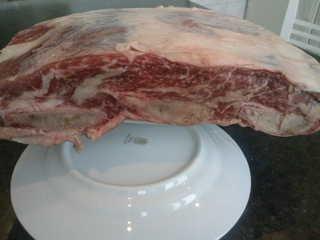 Приготовление блюда было приурочено к празднику, посвященному встрече с 800-й феей, поэтому для его приготовления была взята лучшая часть молодого бычка. Неее, не рибай, бери выше. В том , что в разрезе на ребрах мраморность выше, можно убедиться в прикрепленной фотке. В рукав такой кусок (а это стандартный размер) не залезет. Резать его — преступление, поэтому, как в школе учили - кусок целиком солим, перчим, добавляем пару листиков лаврушки (больше никаких специй), кладем в противень с высокими бортиками и накрываем все это дело фольгой, плотно обжав ее по краям. Мясо должно тушиться 40 минут на 220 градусов для корочки и последующие 60 минут — при 130 градусах для образования должной мягкости. Ну, а по сочности с этим разрезом тот же рибай рядом не стоял. Нежнее мяса не встретите. Приятного аппетита))