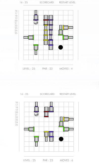Трубу 1 (нижнюю фиолетовую), и верхнюю красную надо передвинуть еще без шарика. А потом уже двигать к ним шарик.