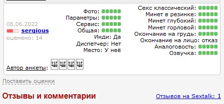 Примечательный пример комментария и оценок пользователя sergious на интимсити под анкетой https://www.intimcity.nl/persons.php?id=436320 Одни пятёрки, особенно за сервис после как гостю в носки надудолили домашние животные И далее по тексту/картинкам (полноценный отчёт бы мог получиться в КЛС)