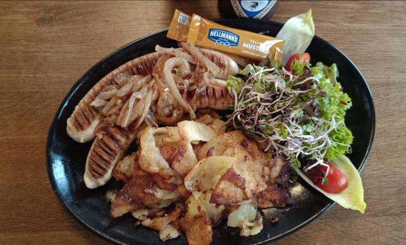 Так как в устрицах по дикости не разбираемся, ели простую немецко-деревенскую еду. Жена куриную ножку, я - жаренные сосиски. Просто, но приготовлено идеально, плюс энергетика повара