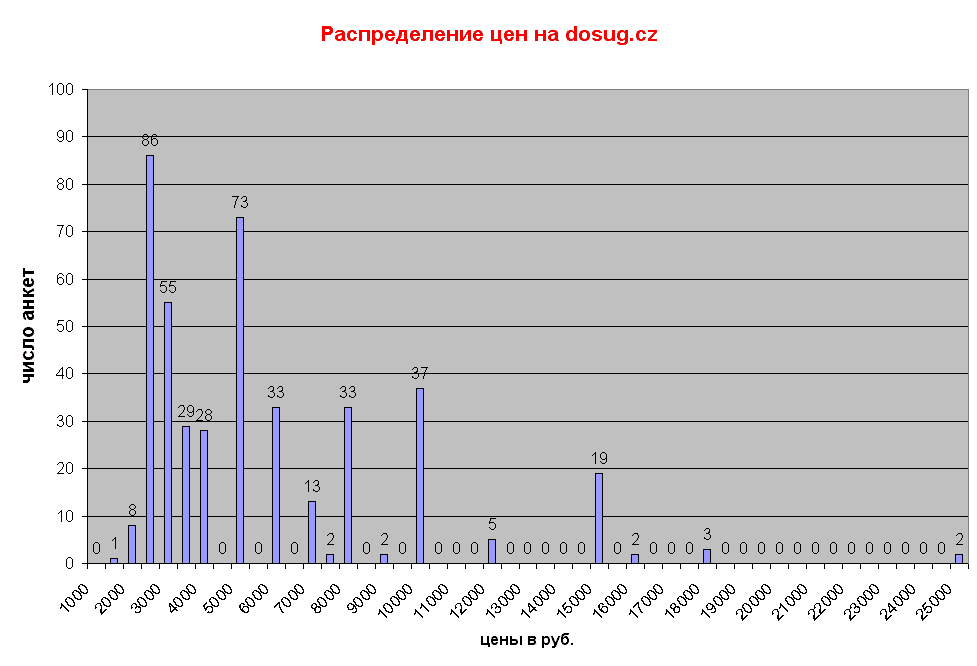 Тут у нас пошел спор о ценах на рынке платного секса, в частности, что считать "бюджетной" ценой, а что нет. Разговоры, разговоры... Хочется хоть немного твердых цифр. Так давайте посчитаем! Взял цены dosug.cz да и построил диаграмму. Всего анкет было свыше 700, но чуть ли не половину цену не заявляет, так что обработал 433 анкеты. Везде цена - за 1 час в апартаментах. Тут исходник в Exel. Смотрим на диаграмму. Первый вывод: распределение совершенно ненормальное (это термин), то есть среднюю цену "в лоб" считать нельзя. 1. Цены выше 15000 совершенно неадекватны - их всего 7 из 433, можно игнорировать. 2. Пик 15000 - 19 анкет 3. Пик 10000 - 37 анкет 4. Пик 6000 и 8000 - по 33 анкеты в каждом 5. Пик 5000 - 73 анкеты 6. Наконец, нечто напоминающее распределение - от 2500 до 4500 Отсюда такие выводы: средняя цена тяготеет к 3500. Все, что ниже, можно считать "бюджетным". В районе 5000-8000 немало анкет, видимо, в этой ценовой категории лучше качество. То же самое, но с большей степенью условности, можно сказать про 10000. Все, что выше, можно списать на аппетиты фей.