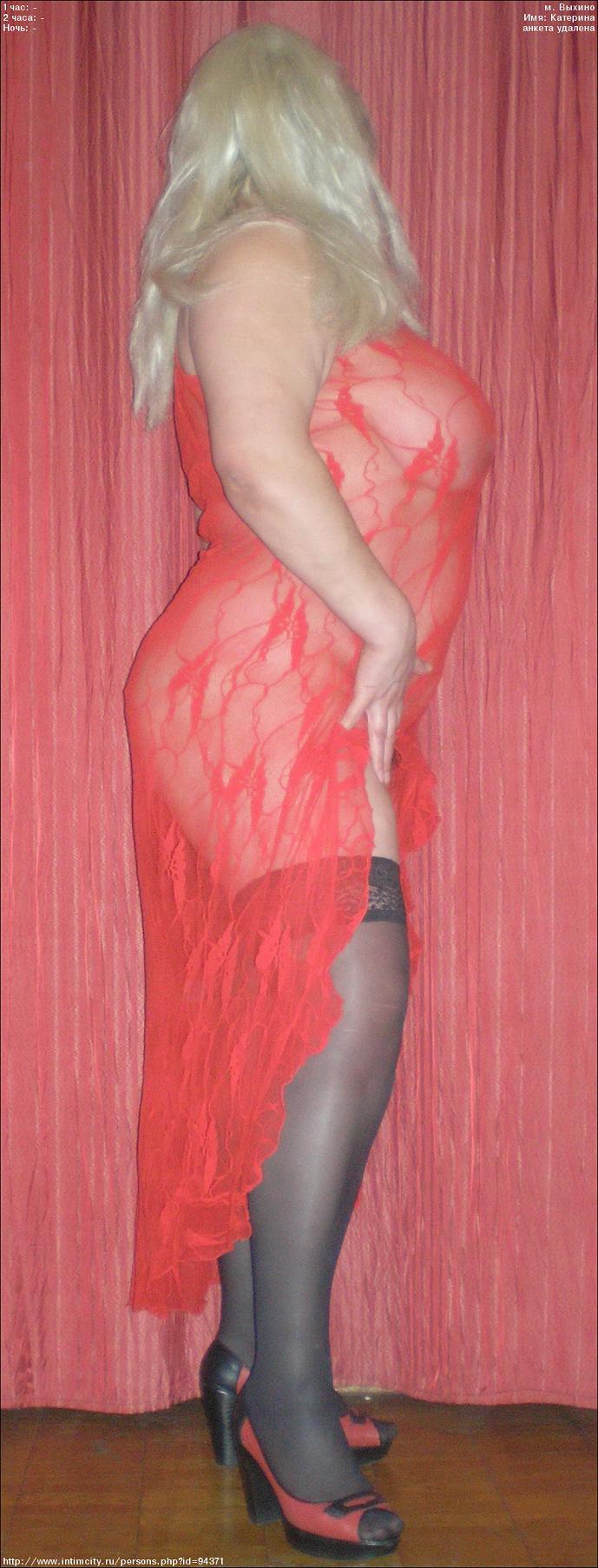 Анкеты с фотами без лиц интригуют. Создаются всякие иллюзии, а неизвестность завораживает и манит… Отвечает на звонок Катерина сразу, общается охотно и доброжелательно. Впечатление, что не раскрутилась еще пока и поэтому нет потока. Решено, едем! Парковка отличная, подъем пехом на третий этаж. Катя! Ох, и здорова же, эта Катя!!! А на лицо - миловидна. Фотам соответствует на 100%. Встречает в том же прикиде, что и на анкете. Мое решение остаться встречает ее явное одобрение. Чай-кофе-тапки предложены. Интерьер квартиры можно увидеть в анкете Катиной напарницы http://www.intimcity.ru/persons.php?id=93378. Довелось с ней поздороваться (она – брюнетка) и вежливо пожать ее за сиську . Полотенец был выдан такой, какой легко можно спицдить на окраине любого провинциального городишки, где до сих пор еще принято сушить белье во дворе. Правда, полотенец – большой и глаженный. Лежу, всполоснувшись, в сладком томлении, ожидаю Катю. Появляется Катя и деловито интересуется, как строчить минет: в броне или без? Мое растерянное пожимание плечами она понимает по-своему и начинает минетить без резины. Вопрос о доплате за МБР не поднимался ни одной стороной ни до, ни после порцесса. Вроде, все - здорово, сосет глубоко, энергично, явно с душой, но … с зубами. Как-то так увлекся наблюдением за своими ощущениями, что потерял контроль, вдруг резко захорошело и отстрелился в башню. Катюха поспешно убежала отплевываться. Знать бы наперед, надо было бы пожевать ананасувую жвачку! Межпалочный перерыв посвятил изучению Катиных прелестей. Но лучше не любопытствовать, что там у нее под эротической накидкой. И так заранее все понятно. Предложил бы следующую градацию зрелой женской красоты: Рубенсовские, потом Кустодиевские и потом просто толстые тетки. Но Катина жирнота какая-то добрая, не отталкивающая. А в местах общего пользования имеется легкая поросль. Вволю помяв здоровенные сиськи, с удовольствием просто отксил Катюху в миссии. Потому что ковырять ее всяко-разно точно не с руки. Комфортно оказалось с Катей, энергетика у нее явно положительная. И впечатление осталось какое-то такое, что все было по-честному.