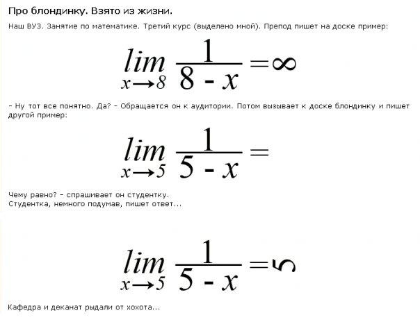 Это нестандартное мышление! Шляпу снимаю перед такой "Блондинкой"  А случай из жизни нашего же курса. Есть в науке, и в частности в биохимии, понятие "Аффинность" (affinity) - значит, притяжение противоположностей, пример: антиген-антитело, сперматозоид-яцеклетка, фермент-субстрат, фермент-ингибитор, х.... - п...да , ключ-замок и так далее. Вот и попросили одну бландинку (натуральную) ответить на вопрос, что такое аффинность. - Ну, затрудняюсь..... - Пример. Фермент-субстрат. - УГу............ -Антитело - ??????????? Стоит и думает долго.............. - ТЕЛО! Ржали все, включая лаборантку. На самом деле смешно только тем, кто так или иначе сталкивался с биохимией.
