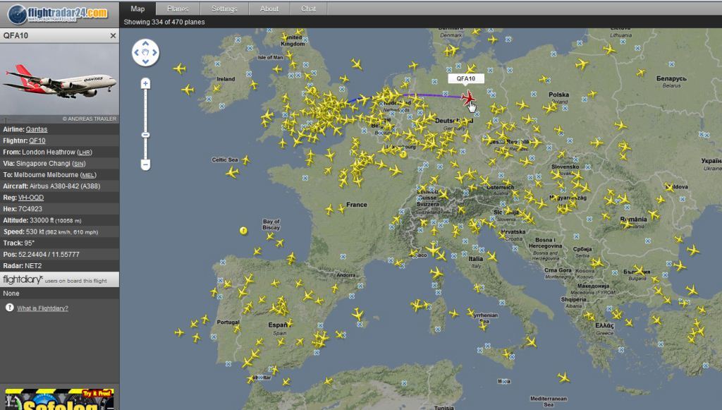 Спасибо. Прикольно. Над Лондоном действительно кишмя. (Там, как я понял, и аэропорты можно посмотреть - кто взлетает-садится). Еще Париж и Франкфурт загружены. А над Италией и нету никого - нафиг она кому сдалась.  Почему-то почувствовал себя не авиадиспетчером, а операторм ЗРК.