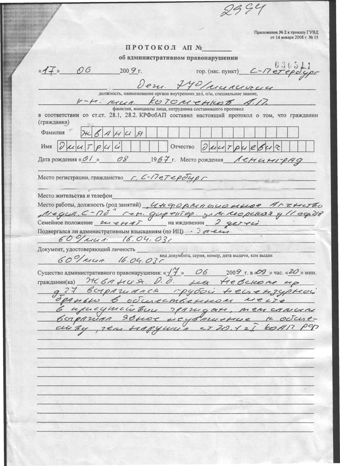 Как видите по форме протокола с вас требуют 4 подписи: - Роспись в том, что вам разъяснены права и обязанности, Речь идёт о ст.25.1 КоАП и ст. 51 Конституции. (их никогда не разъясняют, ибо сами полицейские их не знают). - Подпись под объяснением ваших действий совместно с наличием/отсутствием у вас заявлений. - Роспись об ознакомлении с протоколом. - Роспись в получении копии протокола. 4.1. Если права вам не разъяснили так и запиши́те «права не разъяснены» и подпиши́тесь. 4.2. Если адвоката рядом с вами нет - вам самим нужно решить, что писать в объяснениях. Вы можете стандартными фразами объяснительных или записать своё: - От дачи показаний отказываюсь на основании ст. 51 Конституции до консультации с адвокатом. - Я участвовал в мирной акции, незаконных действий не совершал, подробные показания дам после консультаций с адвокатом. (желательно конкретную формулировку продумать заранее с организаторами и/или координаторами например «Я участвовал в мирном шествии, разрешенном Правительством Москвы...») 4.2.1. Если можете, укажите свидетелей вашего задержания, которые не были задержаны — впишите их ФИО. 4.2.2. Если есть опасения, что на вашего свидетеля будет оказано давление до суда, то напишите примерно так «Свидетелем моего задержания, который подтвердит, что я не совершал противоправных действий является парень по имени Сергей, фамилию не помню, начинается на букву П, проживает в районе таком-то, точный адрес знаю визуально, явку в суд обеспечу сам» 4.3. Если у вас есть замечания (например, при задержании у полицейского не было значка или если у вас ещё нет защитника напишите «Мне нужен адвокат» или не дали сделать один звонок родственникам, запишите и это – всё что сможете «накопать») и прочие важные моменты то впишите их, так как протокол — единственный документ с вашими словами, который точно попадёт в материалы дела. Если вам не хватает места - можете написать их на отдельной странице и в протоколе указать, что объяснения прилагаются на дополнительном листе. 4.4. Так же в протоколе рекомендуется написать «Прошу рассмотреть дело по месту моего жительства на основании ч.1 ст 29.5 КоАП РФ». Если данное ходатайство будет удовлетворено то шансы решить дело в вашу пользу увеличатся, так как суд по месту жительства мало связан с задержавшим вас отделом полиции. После того, как вы (или с ваших слов) всё в протоколе записали, вас попросят расписаться, что с протоколом вы ознакомлены. 4.5. Прочитайте протокол и обязательно распиши́тесь, что с ним ознакомлены. Отказ от подписи/визирования вообще ни где не допускается, а при отказе подписания протокола просто вызовут двух свидетелей и они подпишутся, но большой вопрос под чем они подпишутся? Может они напишут, что вы полностью признали свою вину? В ваших интересах лично прочитать и расписаться. Интересный момент. Если в протоколе ваши ФИО указаны не верно - так даже лучше, легче будет развалить дело в суде. Т.е. это несоответствие можно «не заметить» при подписании об ознакомлении протокола. 4.5.1. Важно. Потребуйте копию протокола перед тем, как поставить подпись о её получении. В этот момент почти во всех ОВД ломается ксерокс и вас просят просто подписать протокол. Предложите сотруднику полиции, что вы подпишите «копию не получил» и распишитесь, ибо врать вы не умеете. Иногда это помогает починить ксерокс. Если нет —