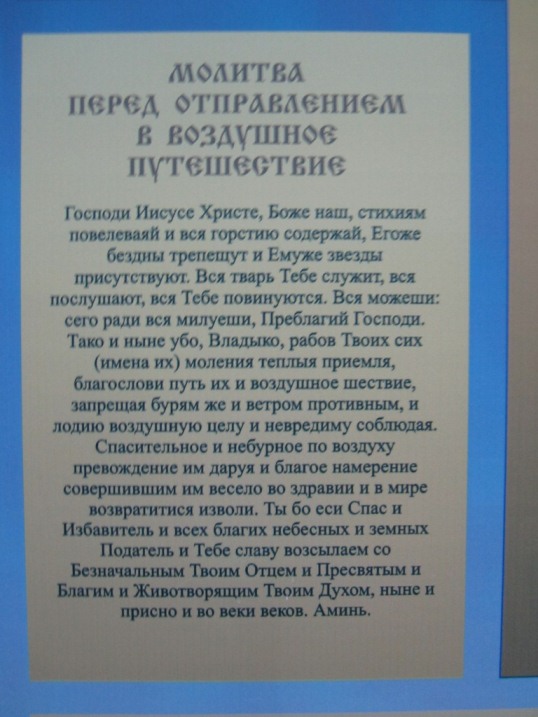 то процедура будет выглядеть следующим образом - вызываются сотрудники службы безопасности аэропорта, которые тщательно осматривают место где вы сидели, куда ставили вещи, чьи вещи стояли рядом на полке ручной клади. Снимается багаж из багажного отделения. Именно такую картину я наблюдал, когда пара мужик с своей подругой муклой, силиконовым губами и силиконовыми сиськами и очень смазливым @лядским личиком сначала сели в самолет, поставили ручную кладь, потом резко отказались от полета. Самолет к слову заменили, должен был лететь боинг 737, но полетел ЯК-42 Видимо тесные кресла, заход на борт по лесенке сзади, воспоминания о недавней авиакатастрофе в Ярославле, свист движков если сидишь сзади произвели неизгладимое впечатление на муклу и она скомандовала мужику - нафег С другой стороны может и не из за этого, а какой то тонкий продуманный ход - типа знают что вы летите, проводили в аэропрт, в Москве вас типа нет, а там куда летите вас тоже нет  Рейс соответственно задерживается, в моем случае на 30 минут. Со слов стюардессы, такая ситуация не первый раз на ее практике, и отказавшихся от полета пассажиров, сопровождают в ментовку аэропорта, где они будут находится до тех пор пока самолет не прилетит в аэропорт назначения Ну ладно рейсом которым летел я лету час с небольшим, но вот если скажем взойдя на борт вас застал звонок, что кто то умер из близких от полета вы отказались, а летите в Варадеро куда 13 часов, будут держать в ментовке аэропорта 13 часов? К тому же непонятна вообще вся эта процедура, типа досмотр в аэропорту несовершенен коли перестраховываются на предмет того, что отказывающийся от полета может подложить, что то взойдя на борт и потом его покинув. Тогда надо искать сообщников в предполетной зоне из числа сотрудников аэропорта, которые могут передать сверток. Но надо полагать и они осматриваются перед входом в эту зону. Ну а тем, кто испытывает страх перед полетом, террористами и турбулентностью - молитва, которую увидел перед выходом на посадку в одном из аэропортов