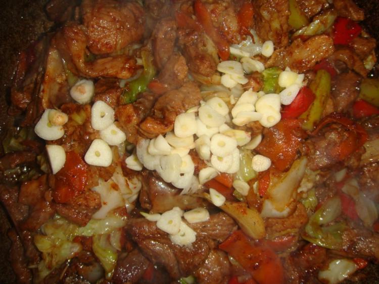 Раздел 1. Тушим ребра на подсолнечном масле с луком по времени - приблизительно 15 минут. В процессе добавляем столовую ложку сахара и пол-ложки соли, 30-50 грамм соевого соуса. Раздел 2. Добавляем овощи: морковь, капуста (можно китайскую), цукини, болгарский перец. Раздел 3. Добавляем 1/4 чайной ложки черного перца и половину столовой ложки красного перца. Раздел 4. Перед подачей на стол необходимо добавить чеснок и пару-тройку минут подержать блюдо с закрытой крышкой.