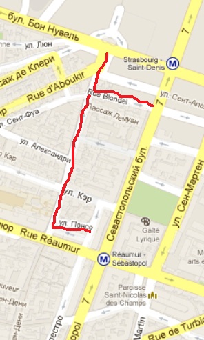 Для интересующихся краеведением сообщу, что Saint-Denis — Святой Дионисий, христианский священник, казненный римлянами в третьем веке нашей эры на холме Монмарт, а Севастопольский бульвар носит свое название в память о победе французов совместно с англичанами над Россией в Крымской войне 1853-1856 годов.