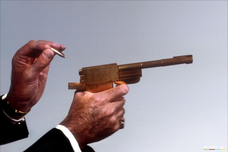 «Человек с золотым пистолетом» (The Man With The Golden Gun) — девятый фильм об английском суперагенте Джеймсе Бонде. Экранизация одноимённого романа Яна Флеминга. В книге плохой герой пользуется позолоченным кольтом, в то время как в фильме у него уникальный, изготовленный на заказ пистолет из чистого золота, разбираемый на ручку (ствол), зажигалку (основной механизм), портсигар (рукоятка) и запонку(спусковой крючок). Великобритания. 1974 год.