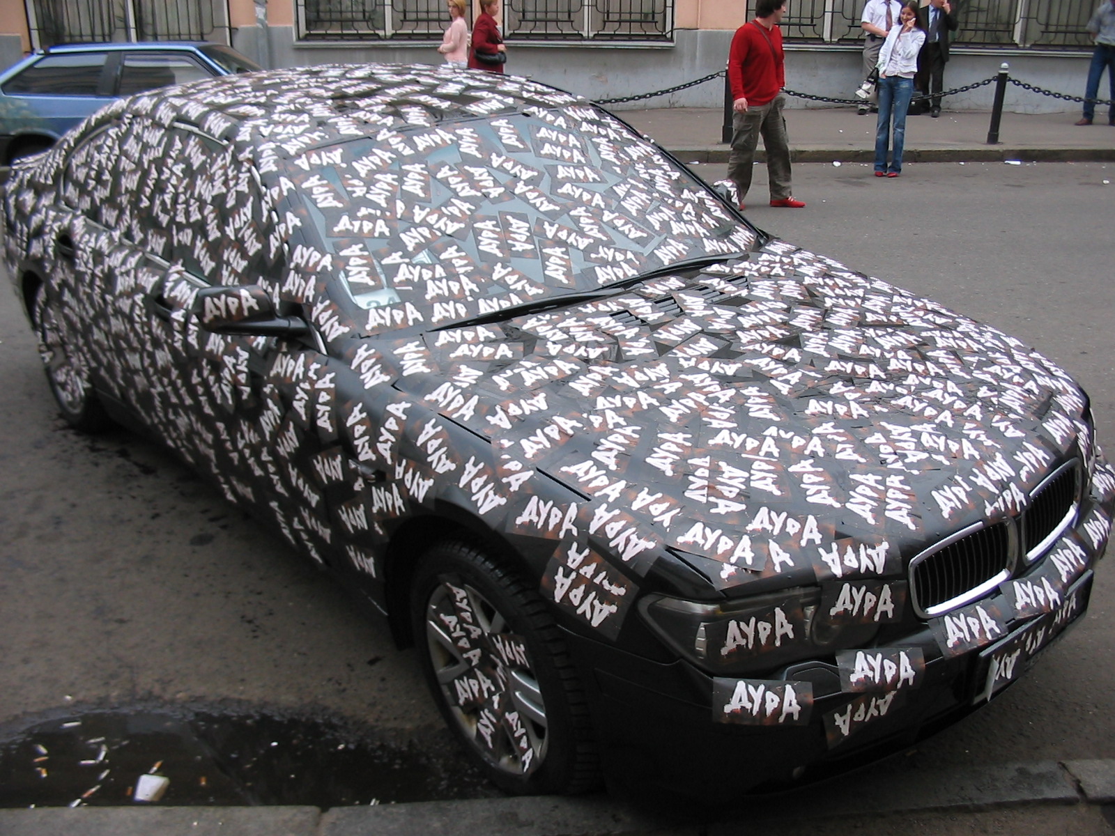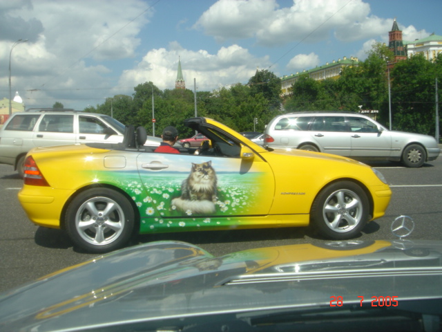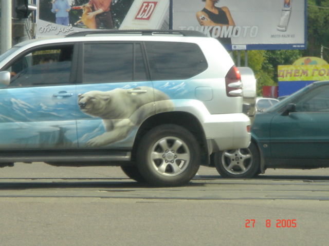 существуют нормативные акты к закону о наружной рекламе, по которым любые надписи на машинах, занимающие более определенной(кажется 30%) площади(данной детали кузова или части авто - точно не помню, т.к. автореклама для меня не основной "хлеб") требуют согласования в гибдд и получения отдельного рекламного паспорта. Я уж не говорю про перекраску кузова(хотя бы частичную). Т.о. любые такие "художества" на бортах авто вполне могут служить мотивировкой к остановке гайцами и соответственному "разводу кроликов"