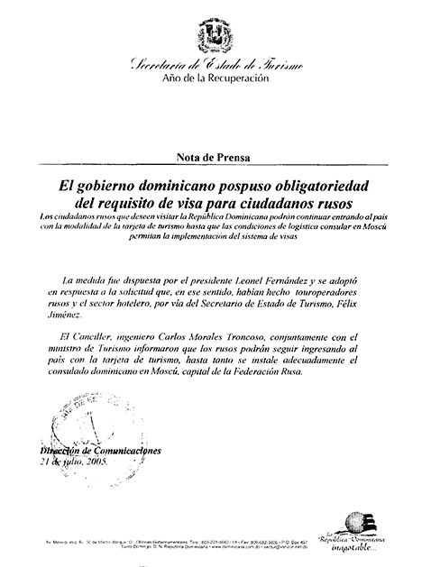 Данное решение было принято Президентом Доминиканской республики Леонелем Фернандесом в ответ на запрос российских туроператоров и отелей, через Министра по Туризму Господина Феликса Хименеса.