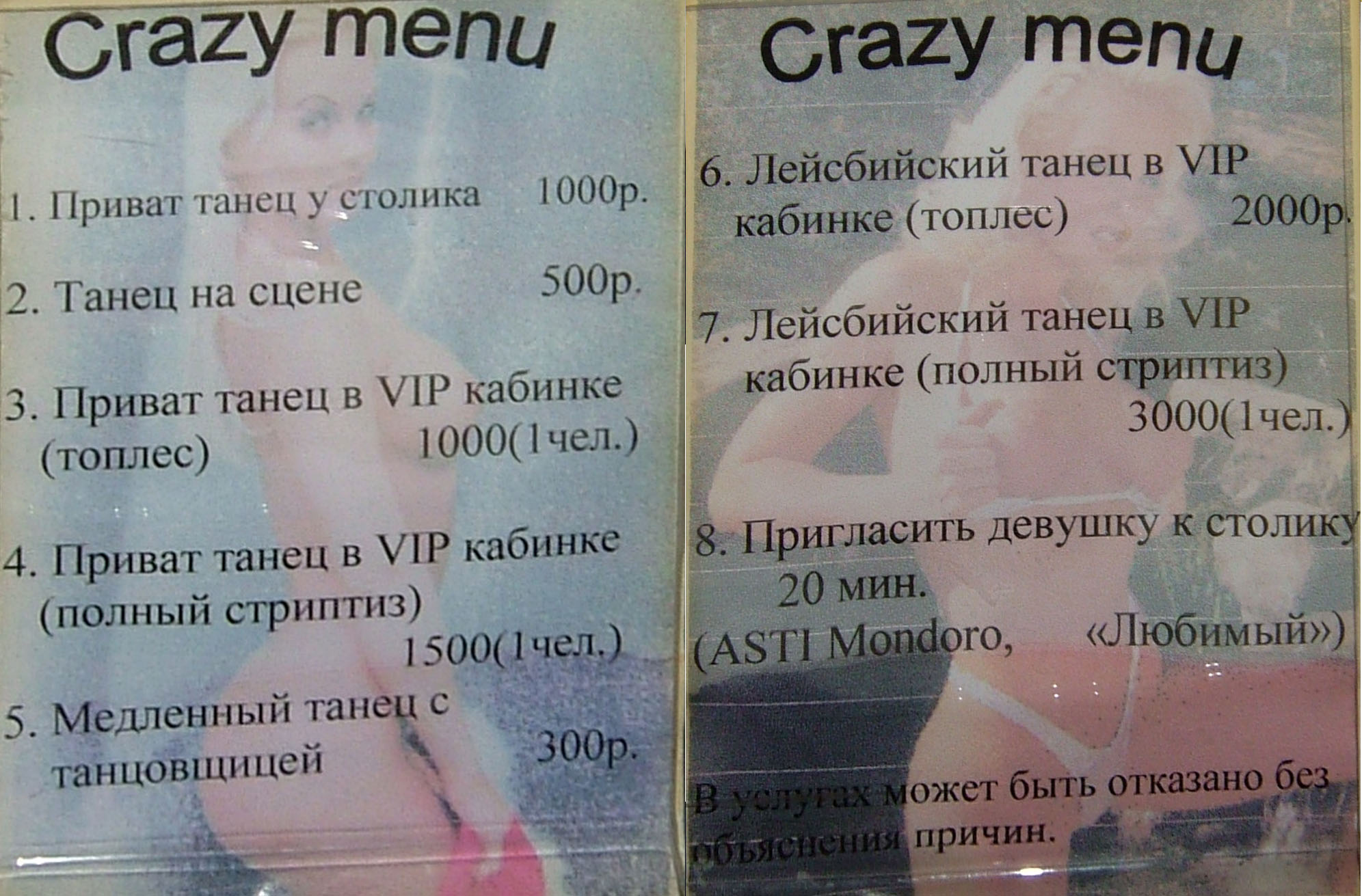 Было бы не честно поставить точку (или жирный крест) на <a href="/showthreaded.php?Cat=0&Number=284440&an=0&page=0#284440" target="_blank">стриптизе в Нижневартовске</a> , не поделившись с уважаемым сообществом впечатлениями от моей второй попытки прильнуть к прекрасному в этом замечательном в некоторых отношениях городе. В новой командировке судьба забросила меня в гостиницу «Венеция», что буквально в пяти минутах ходьбы от упоминавшегося ранее кафе «Медвежий угол». Стриптиз – не стриптиз, а ужинать где-то надо, и зашли мы сотоварищи перекусить туда после тяжелого трудового дня. Обстановка приятная и располагающая к насыщению желудка и приятной беседе. Достаточно просторный зал с высоким потолком. Таким высоким, что над залом еще располагается что-то вроде балкона с ложами (они же VIP-кабинеты), куда ведет лестница вдоль левой стены зала. В центре сцена с шестом (!) и задником в виде скульптурной группы обнимающихся медведей, отгораживающей от сцены (хм... хочется сказать «оркестровую яму», но это скорее возвышение ЗА сценой) место для певцов и музыкантов, исполняющих живую музыку. По причине раннего времени в кафе было немноголюдно и стриптизом не пахло... В правой части зала компания человек 12 отмечала какое-то торжество. Да нас трое – вот и вся публика. Рядом с барной стойкой стоял столик с компьютером, возле которого сидела бабуля, чей голос я видимо в прошлый раз слышал по телефону, и сосредоточенно списывала что-то с экрана в амбарную книгу... Кормят хорошо. Был интересный инцидент, нашедший потом свое продолжение. В честь Арти я заказал текилу. Мне принесли рюмку. Я робко поинтересовался «А лимончик?». Из ступора девушку официантку вывел голос бармена «Возьми вот на блюдце и отнеси...». В процессе поглощения пищи на столе была обнаружена приложенная к данному посту карточка с Crazy Menu, что сразу вызвало подозрения, что стриптиз здесь все-таки иногда танцуют. И танцуют не меньше 2-ух девушек, раз в меню заявлен лесбос. Допрос официантки подтвердил подозрения, но оказалось, что стриптиз будет часов в десять (на часах не было и семи) и вход в кафе подскочит аж до 130 рублей! Мои коллеги не такие фанаты этого вида искусства и после ужина спокойно разбрелись по номерам гостиницы почивать, но плащ Казановы жег мои плечи!!! И около 11-ти, приняв душ, надев свежую рубашку и побрившись, я отправился за прекрасным. На входе честно признался мальчику охраннику что готов уплатить сумасшедшие 130 рублей за удовольствие слушать живую музыку и смотреть шоу. Вошел. В зале из посетителей все та же компания, отмечающая торжество. Плюс я в свежей рубашке и с помытыми ушами. Сажусь за столик с наилучшим обзором сцены. Заказываю двойной экспрессо и текилу. Девушка приносит кофе и через минуту с гордостью (узнала!) рюмку с текилой в которую запиханы две дольки лимона!!! «Что ЭТО!?» «Текила...» «Кто ЭТО сделал!?» «Бармен...» «Вот пусть бармен ЭТО и пьет... А мне, пожалуйста, принесите текилу отдельно, лимон отдельно, а соль я уже сам на столе найду...». Так Hatter привнес культуру пития текилы в Нижневартовск, чем несказанно гордится. Сижу. Пью. Запиваю. Живая музыка играет и поет. Компания гулевает... Стриптиза что-то не видать. Спрашиваю официантку, когда же ослепительное яркое шоу, на которое я не пожалел кровные 130 рублей. «А ОНА танцевала как раз перед Вашим приходом. Скоро опять выйдет». Жду этого «скоро» еще полча