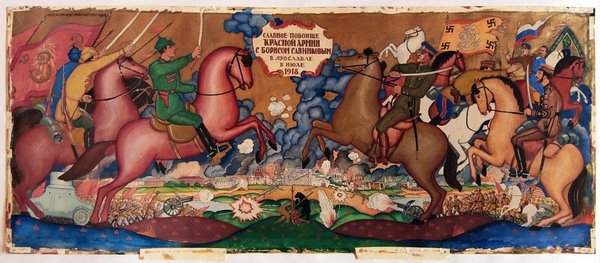 В 1920-х он (по горячим следам) создал серию акварелей "Ярославский мятеж", которую выполнил в лубочной стилизации. Одна из них названа "Славное побоище Красной Армии с Борисом Савинковым в Ярославле в июле 1918". Кони под красными в духе иконописи и К.Петрова-Водкина. В верхнем правом углу привлекают внимание сакральные элементы и флаг нынешней расцветки.